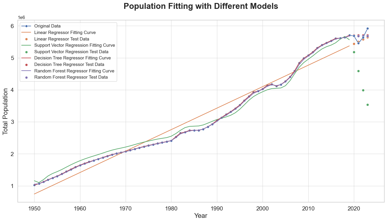 This suggests that ensemble methods like the Random Forest Regressor may provide better generalization and robustness in predicting future population values.